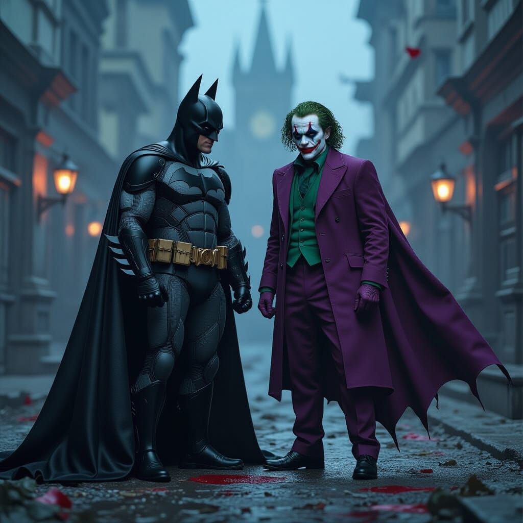 This image captures Batman and the Joker joining forces against a magical Red Carnage. The scene is rendered in a detailed, dark fantasy style with a cinematic feel.