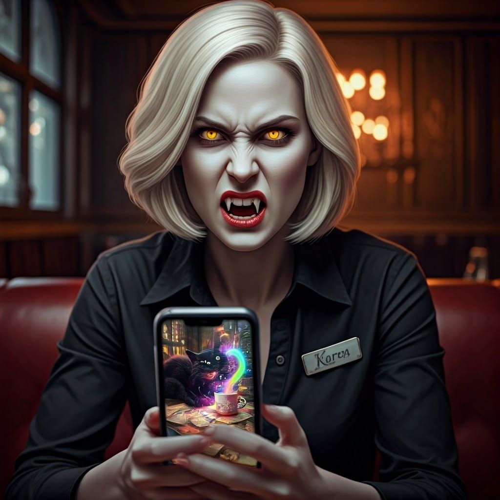 A striking image of a vampire woman named Karen, with a menacing expression, sitting in a dimly lit coffee shop. She's surrounded by mystical symbols, ancient scrolls, and a whimsical scene with a mischievous cat, colorful milk, and a wizard's wand.