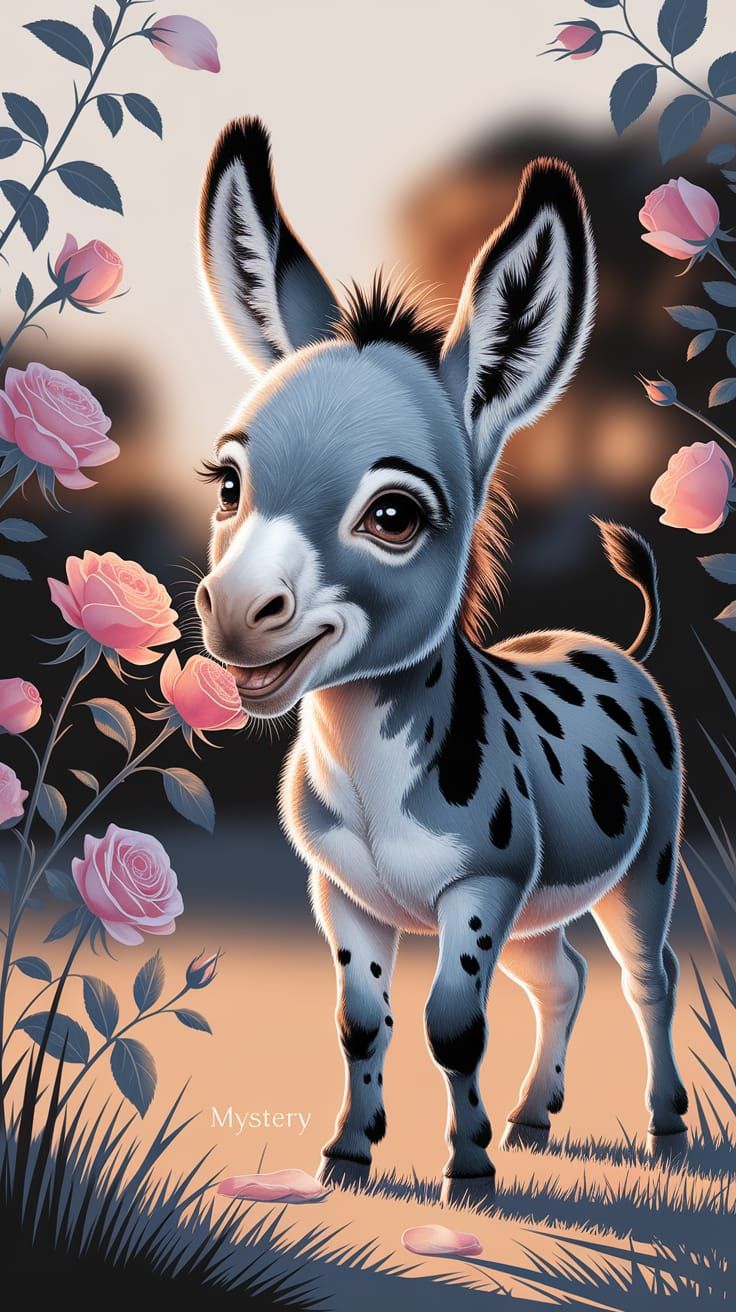 A striking picture of a happy baby donkey eating roses in a meadow. This hyper-detailed ink drawing uses warm lighting and vibrant colors to create a maximalist illustration.