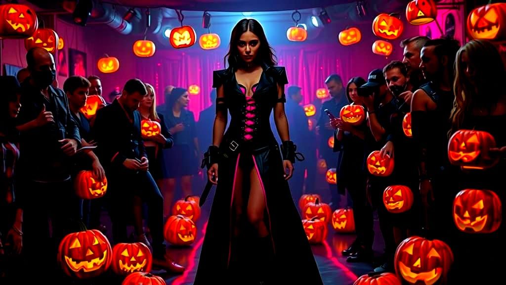 This image shows a modern gothic woman at a Halloween party. The scene is filled with grunge rock-type people, jack-o'-lanterns, and brilliant neon colors in a dark, fantastical style.