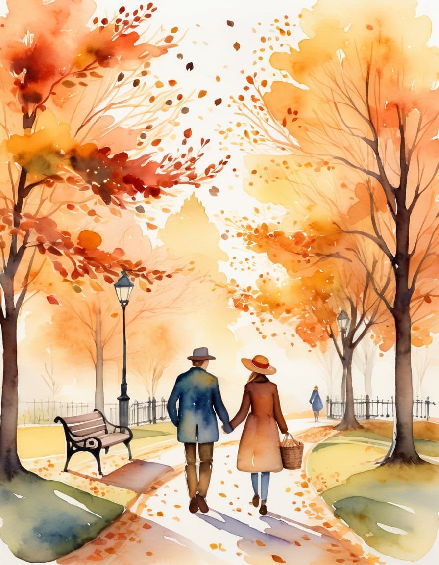 A vibrant watercolor illustration of a couple walking hand-in-hand through an autumn park. Golden light filters through the trees, creating a warm, romantic, and nostalgic atmosphere in a Beatrix Potter style.
