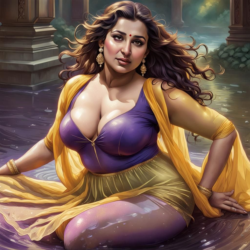 An 8k resolution portrait of an Indian actress with wet skin and crystal-shine hair, wearing a yellow skirt and gold shirt. Digital art with dynamic lighting and intricate details.