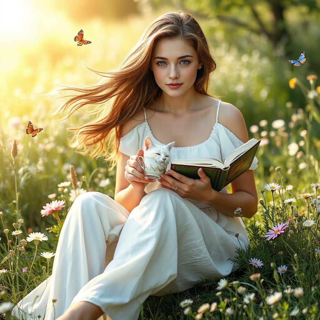 This image shows a beautiful woman with light brown hair and blue eyes enjoying tea in a sunlit meadow. Butterflies flutter around her as she reads, with her cat sleeping on her lap, rendered with hyperrealistic detail and vibrant color.