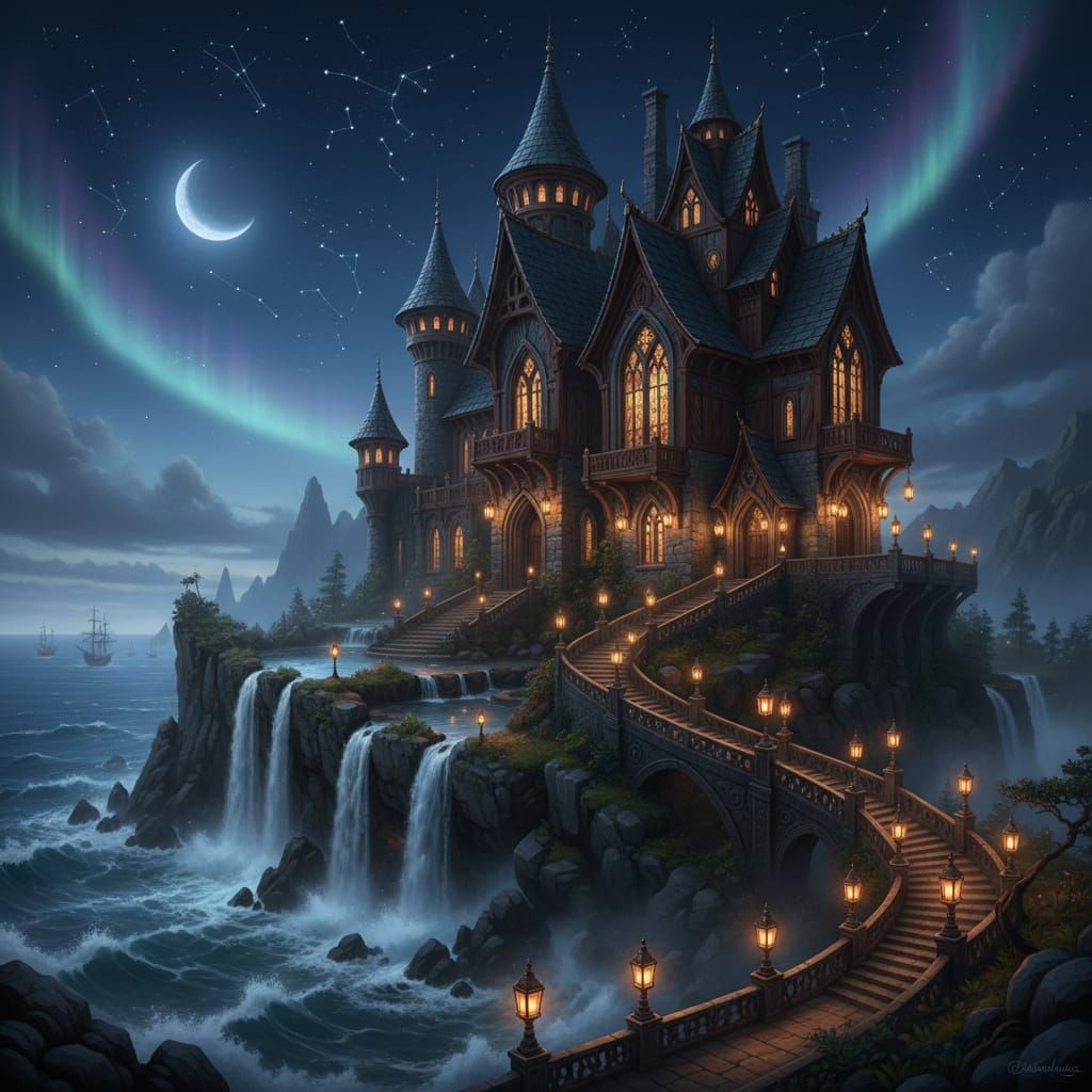This image showcases a grand fantasy mansion on seaside cliffs, featuring Gothic and medieval architecture with pointed roofs and ornate details. Warm lantern light contrasts with the night sky, while waterfalls cascade into the ocean.
