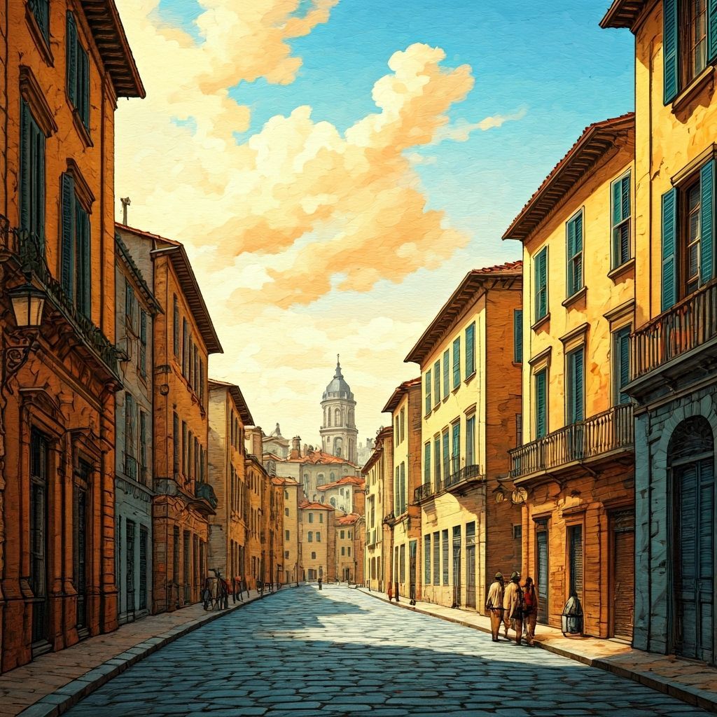 A vibrant scene capturing the essence of joyful living. The artwork evokes a vintage, classical aesthetic reminiscent of 18th-century veduta paintings, with careful attention to architectural detail and atmospheric perspective.