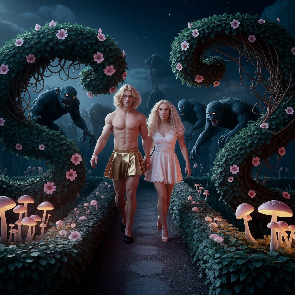 This image shows a surreal garden filled with bioluminescent flora. A man and woman navigate the eerie labyrinth under a starlit sky, while dark monsters lurk in the shadows, creating a mysterious atmosphere.