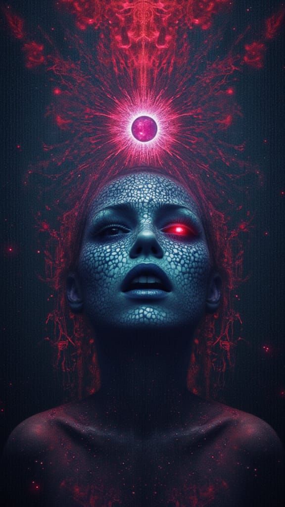 This image depicts a dreamlike mindscape where a serene central face is surrounded by numerous other faces expressing intense emotions, emerging from water in a detailed digital art style.