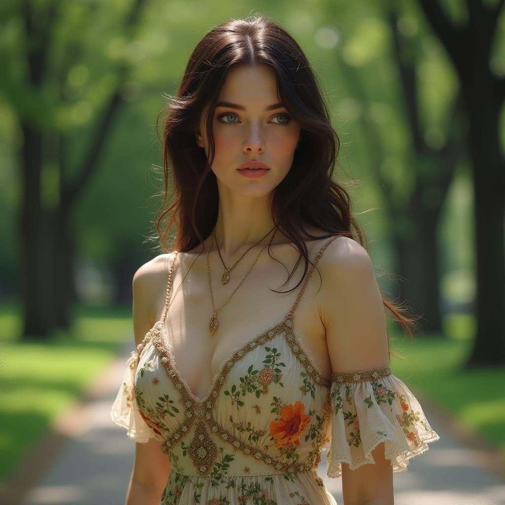 A beautiful Scandinavian woman with striking blue eyes walks through Central Park. Lush greenery and majestic scenery surround her in this image reminiscent of Art Nouveau and realistic portraiture.