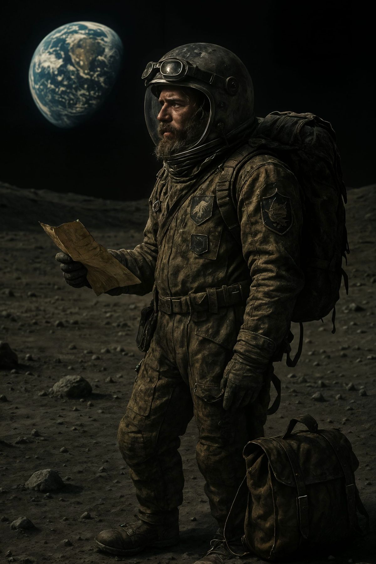 This image depicts a rugged astronaut standing on the barren moon, gazing at a worn map amidst a sea of grey dust and cratered terrain, with the faint outline of Earth visible in the distance, capturing a post-apocalyptic, cinematic atmosphere.