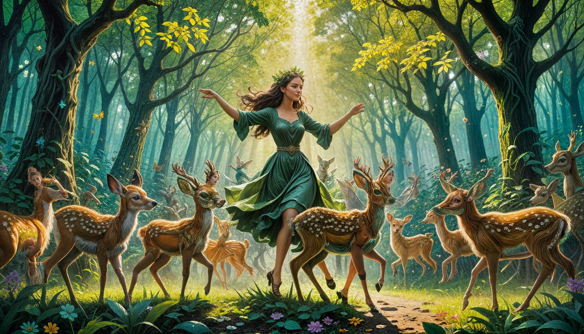 This image shows a woman dancing in a fairy grove, surrounded by children, fawns and fairies. The scene is a colorful display of graffiti and street art, set on a misty spring day.