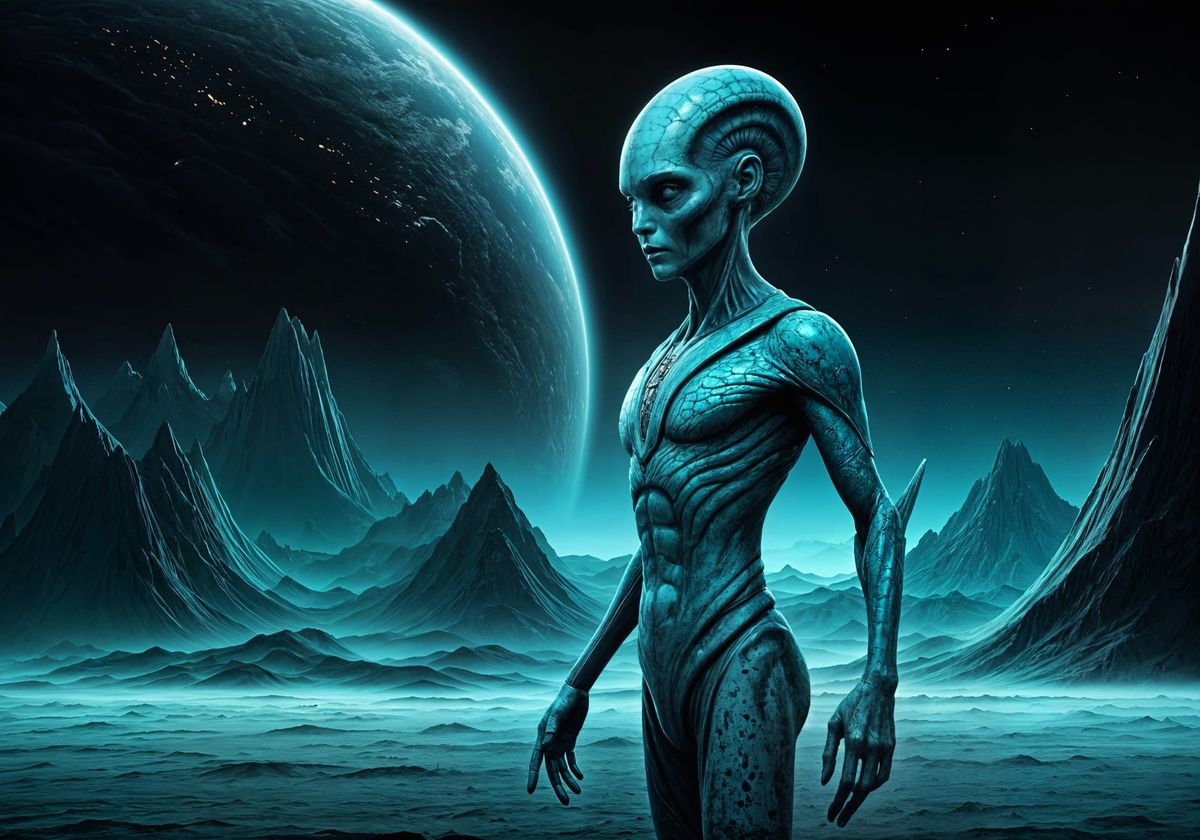This image shows a turquoise alien standing on a similarly colored planet beneath a black sky. Earth is visible in the distance, rendered with hyper-realistic details and cinematic lighting.
