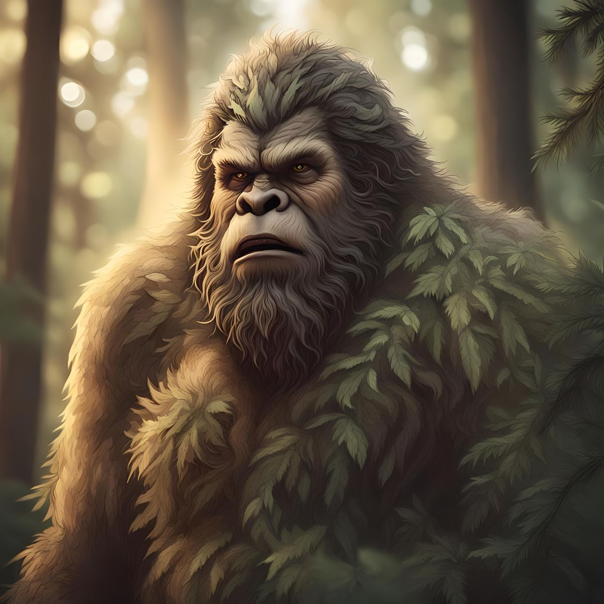A close-up color portrait of Bigfoot with a distrustful expression. The image is rendered with a shallow depth of field and sharp focus, as if captured in a professional studio setting.