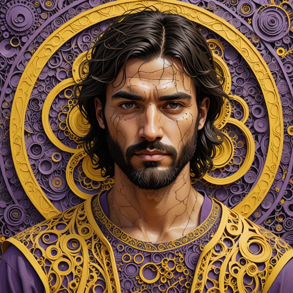 A striking picture of a beautiful man with bronzed skin wearing tattered yellow clothing. The man has short, unkempt black hair, a beard, and dazzling violet eyes in a photorealistic style.