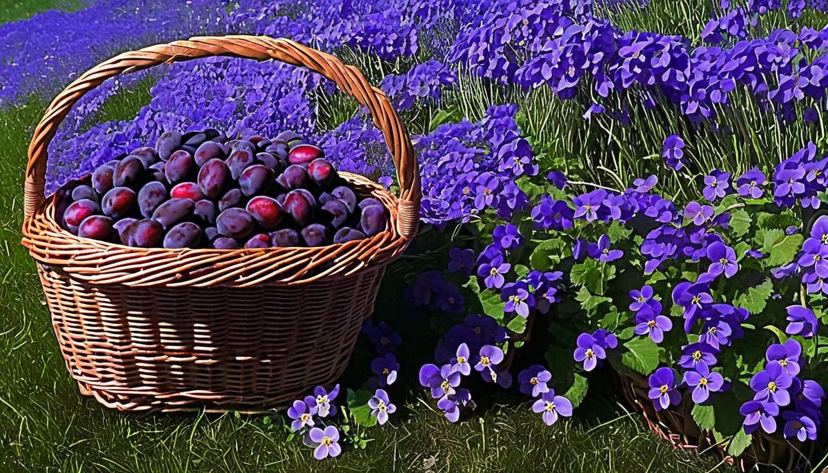 This image shows a rustic wicker basket overflowing with ripe, purple plums, set against a backdrop of a lush meadow carpeted with delicate violets.