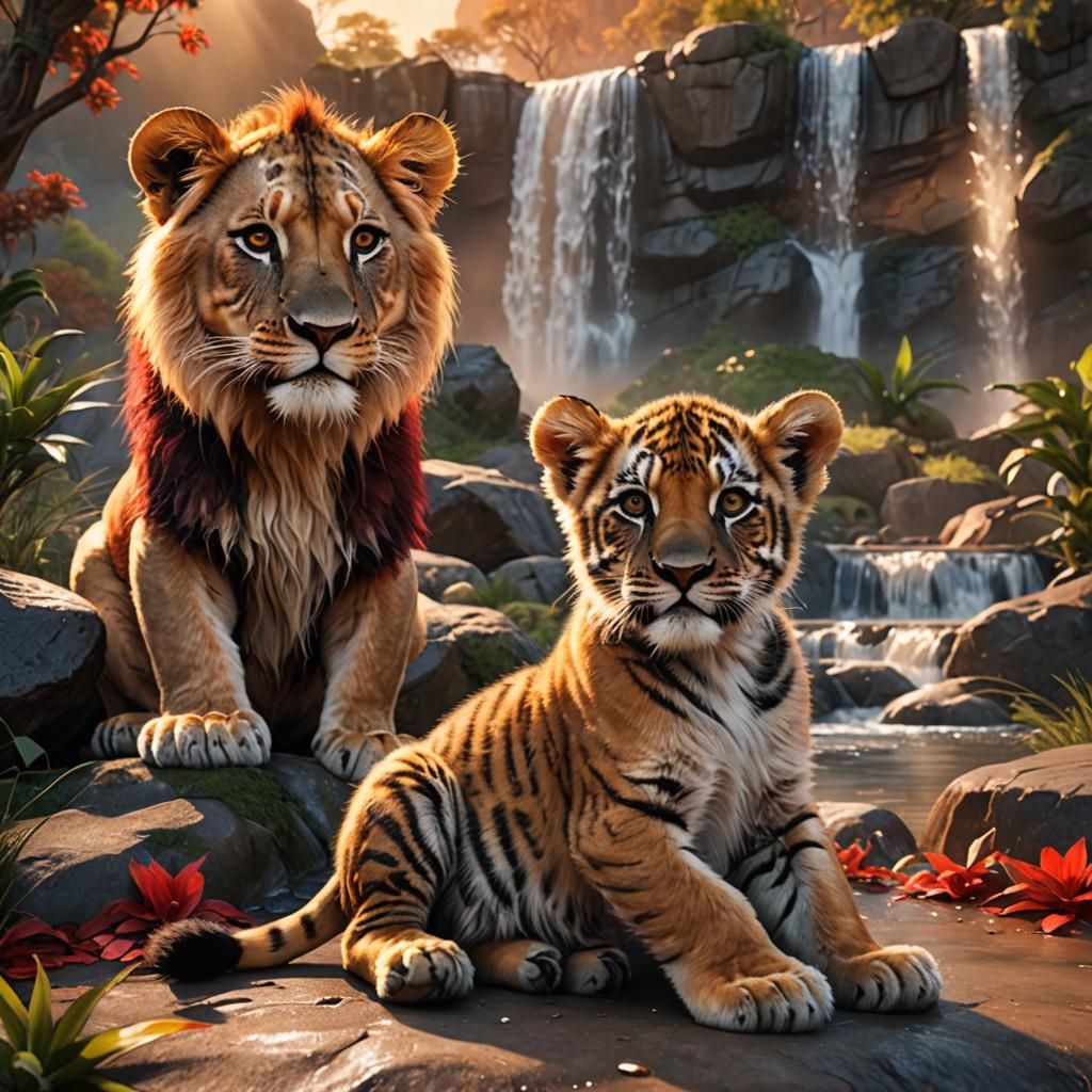 This image shows a cute lion and tiger cub with sparkling eyes sitting near a waterfall at sunset. The digital painting features intricate details and complementary colors.