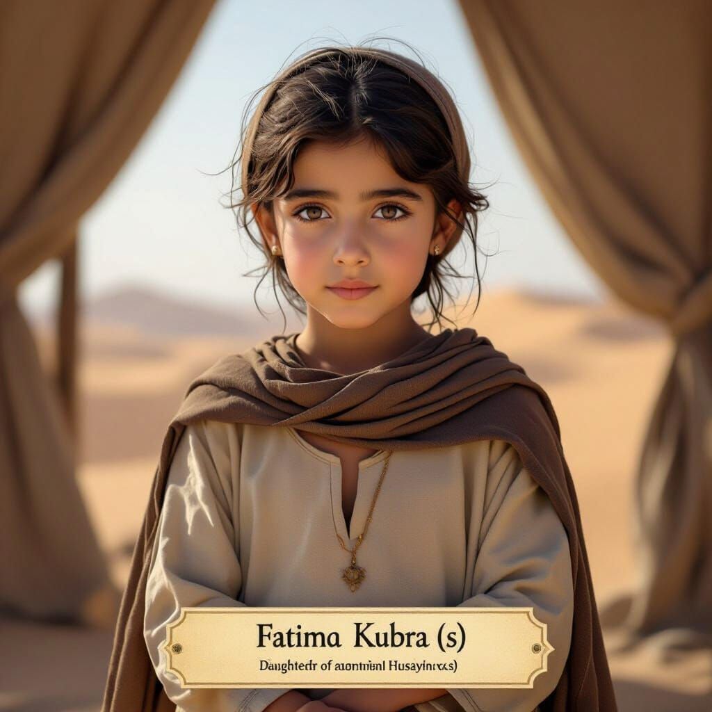 This image shows a realistic portrait of a young Middle Eastern girl, Fatimah Kubra, with a serene expression. Captured in soft desert light with cinematic detail and natural textures.
