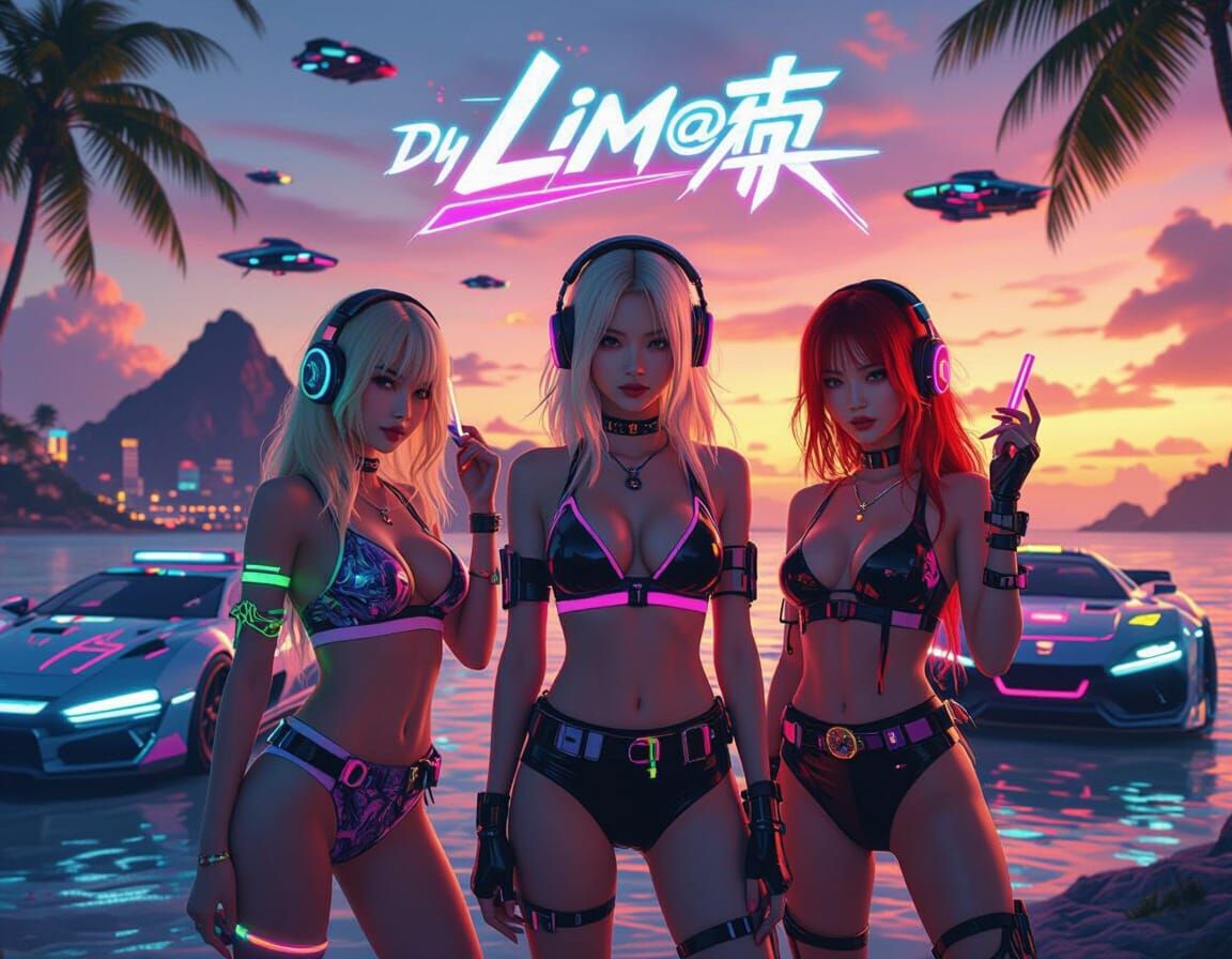 This image shows three girls in neon outfits at a tropical island rave. Flying cars and DJ logos surround them at sunset in a futuristic, sci-fi aesthetic. The image is 3D rendered.