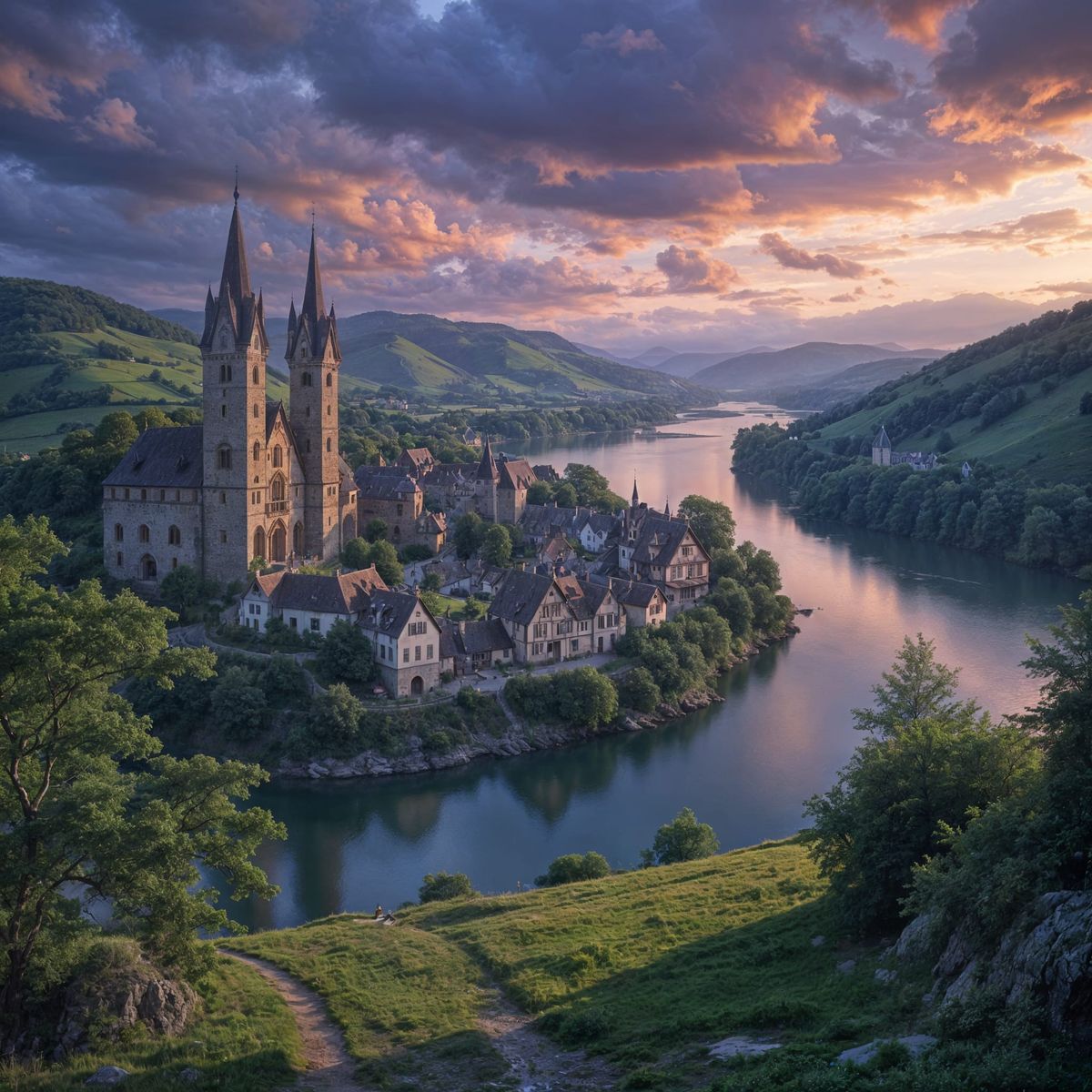 A picturesque fantasy medieval village nestled on a lake shore. The scene features Alsace French architecture, rolling green hills, and scattered fields under a vibrant sunset with iridescent light.