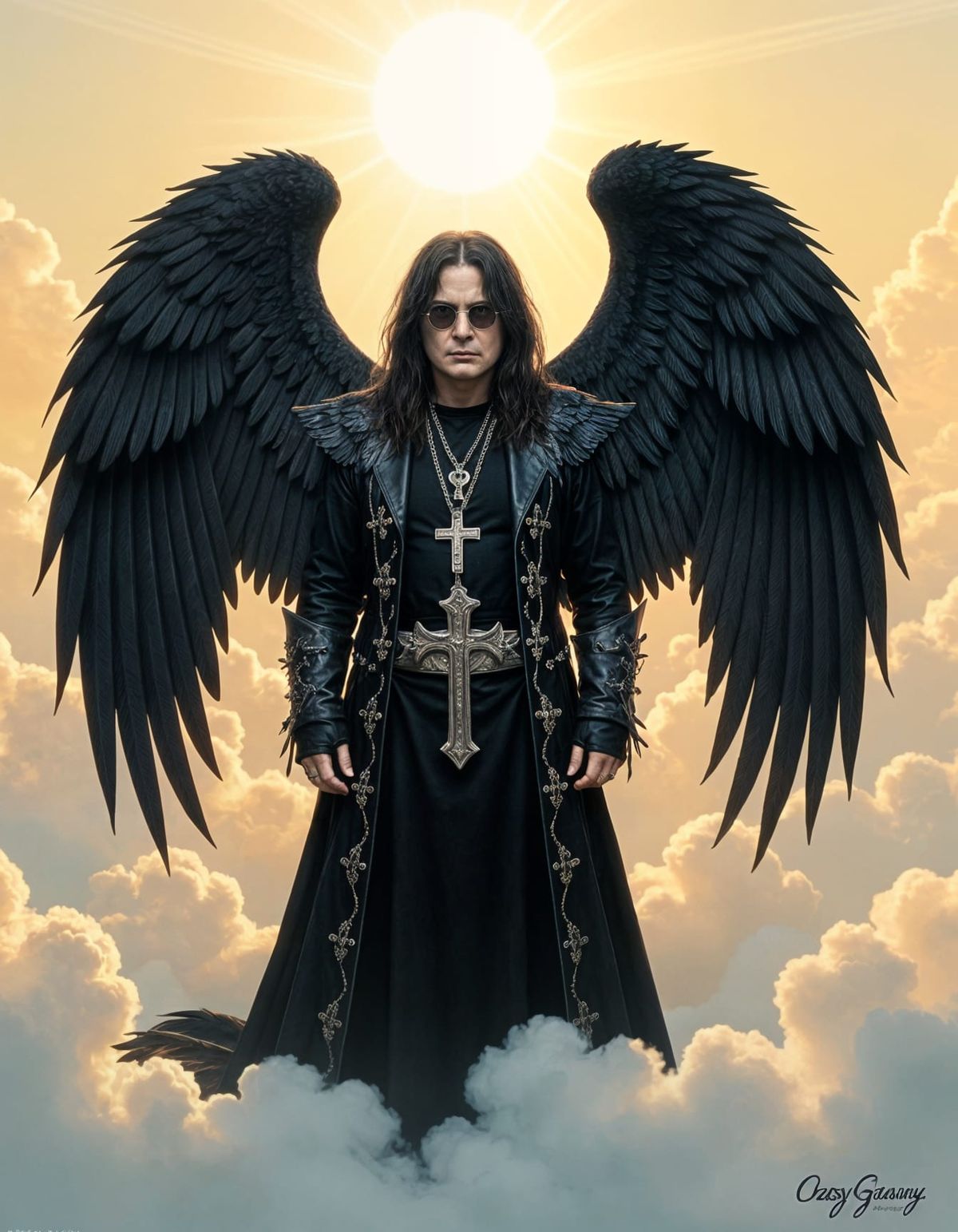 This image shows Ozzy Osbourne with large black feathered wings, dressed in black, standing in clouds. Warm sunlight backlights the scene in a style reminiscent of atmospheric fantasy art.