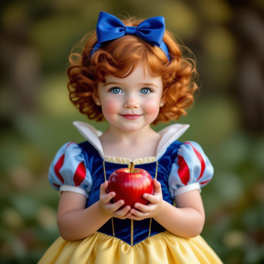 This image shows a 3-year-old girl with curly red hair and blue eyes, dressed as Snow White, holding a red apple. Photorealistic style with soft, fairytale lighting and a forest bokeh background.