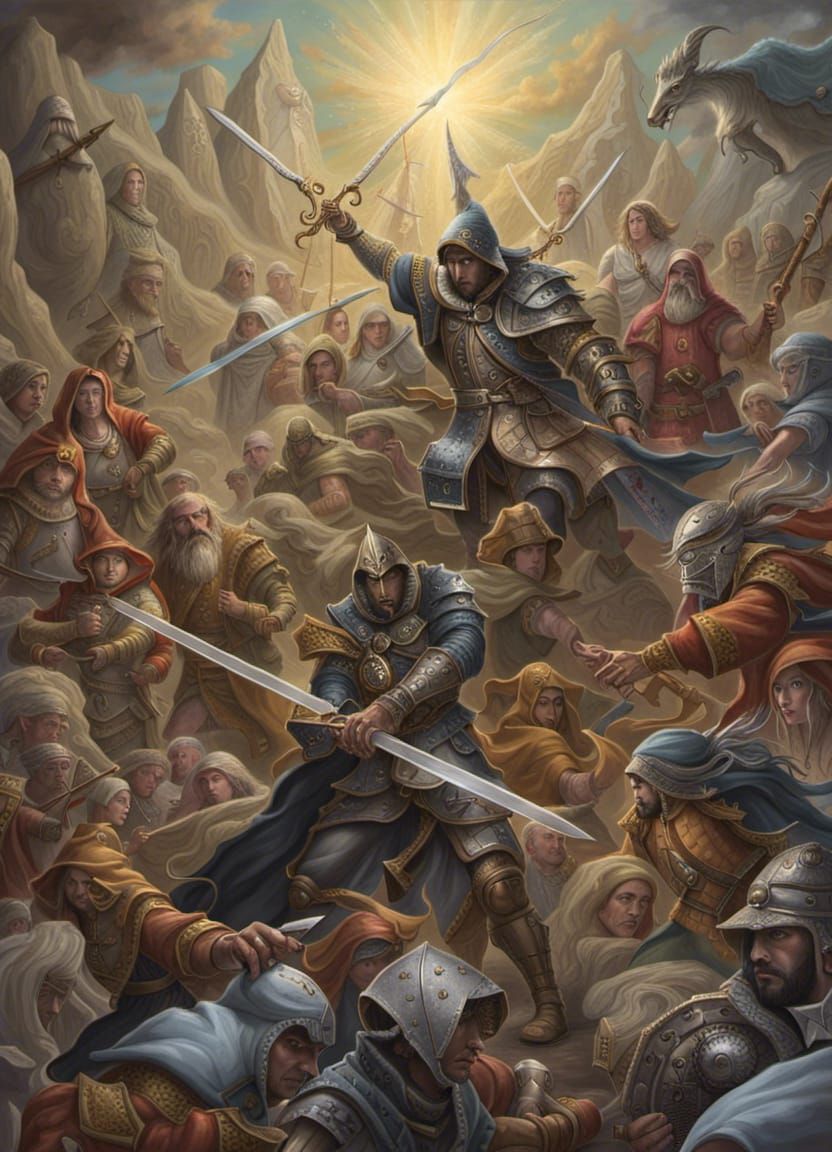 This image shows a dramatic fantasy painting with two groups of warriors and wizards in conflict. The surreal, highly detailed artwork features elements of magic and swords.