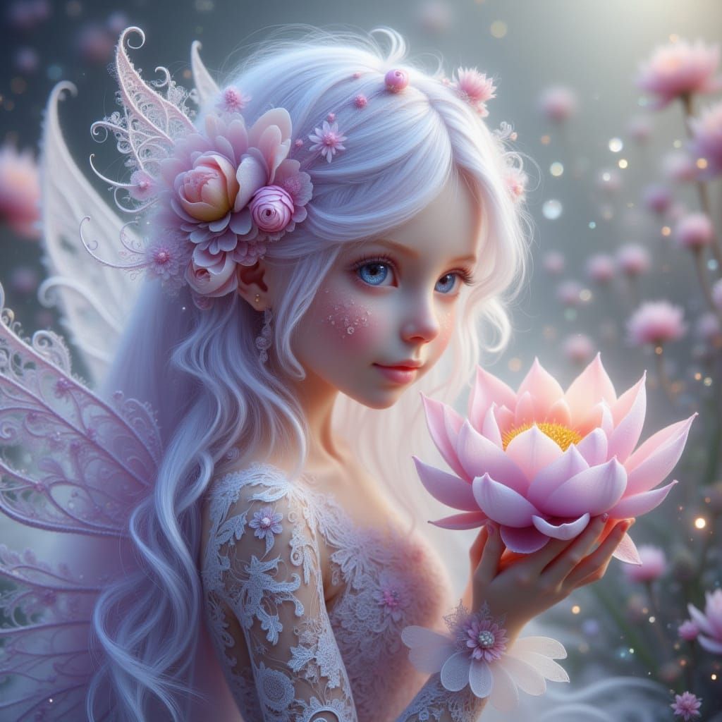 A magical image shows a young fairy painting a lotus flower. She has lilac hair and wings, and wears an intricate lace dress. Silver lighting enhances the ethereal scene, reminiscent of Art Nouveau.