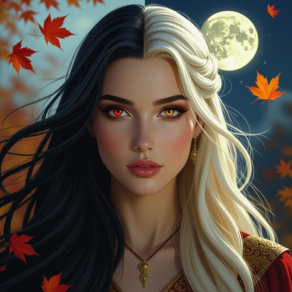 This image shows a diptych of a goddess with flowing hair. One side features black hair and red eyes, while the other displays blonde hair and golden eyes, set against a backdrop of falling autumn leaves and a full moon.