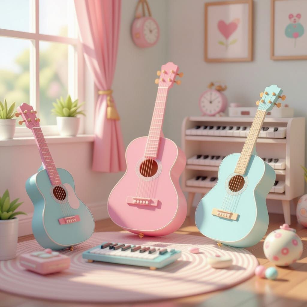 This image features a cheerful collection of toy musical instruments in soft pastel colors, rendered in a delightful 3D anime art style.