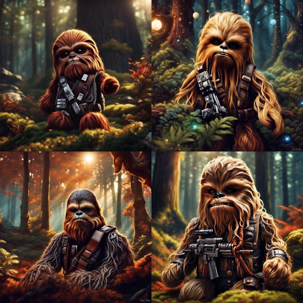 This image shows a close-up of a crocheted Wookiee toy in a forest. The yarn creation features deep colors, intricate patterns, and bright, dramatic lighting, as a maximalist digital artwork.