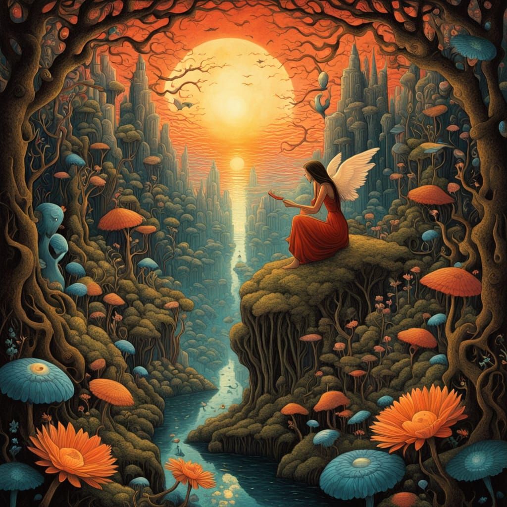 This captivating image depicts a mystical shaman amidst a labyrinth of music, surrounded by a stunning sunset, as they carefully assemble pieces of cracked mirrors into a colorful, intricate sculpture. Inspired by the dreamlike fantasy of Expressionism and Surrealism, with vibrant, bioluminescent details...