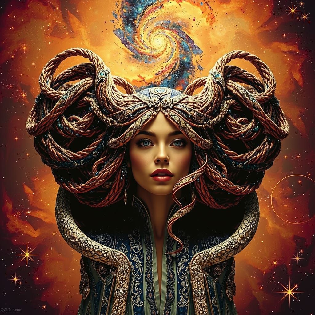 This image shows a celestial figure adorned with stardust, set against a backdrop of swirling nebulae. The artwork blends hyperrealism with cosmic expressionism in deep blues, purples, and golds.