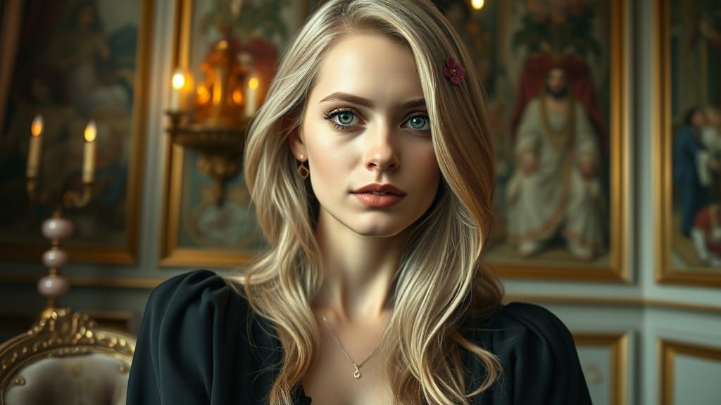 This image shows a stunning portrait of a woman in an elegant setting, with a dramatic and luxurious expression. The artwork features intricate details, warm lighting, and a sense of mystery, evoking the style of Gustav Klimt and Edward Hopper.