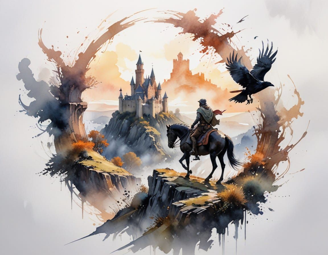 A dramatic watercolor painting shows a medieval castle on a rocky hill at dawn, with mist and a lone rider. The artwork features expressive watercolor techniques and splashy elements.