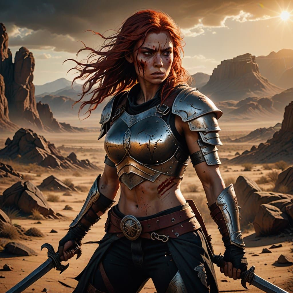 This image depicts a powerful, battle-hardened warrior woman standing amidst the ruins of a post-apocalyptic desert, her intense gaze and rugged armor radiating a sense of grit and determination. Detailed textures and realistic rendering evoke a sense of cinematic grandeur.