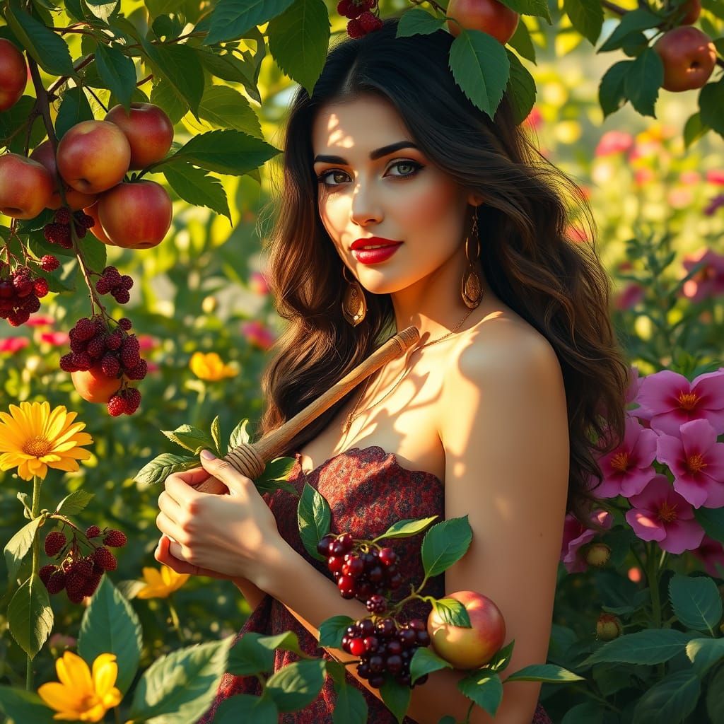 This image shows a beautiful woman surrounded by ripe fruit and honey in a lush garden. The scene is rendered in a digital art nouveau style with expressive brushstrokes.