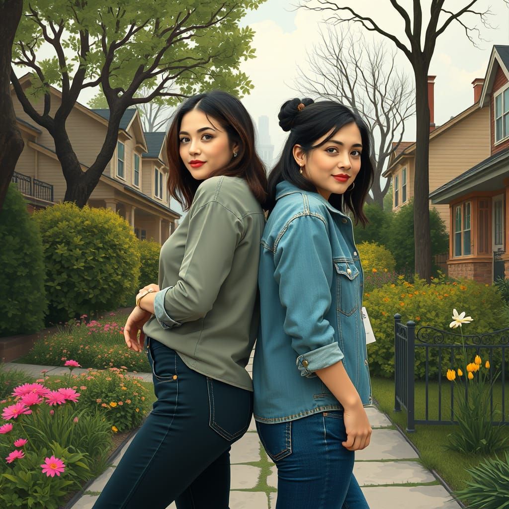 This enchanting image depicts two women standing together in a peaceful neighborhood setting, surrounded by the flowing lines and organic curves of Art Nouveau-inspired design.