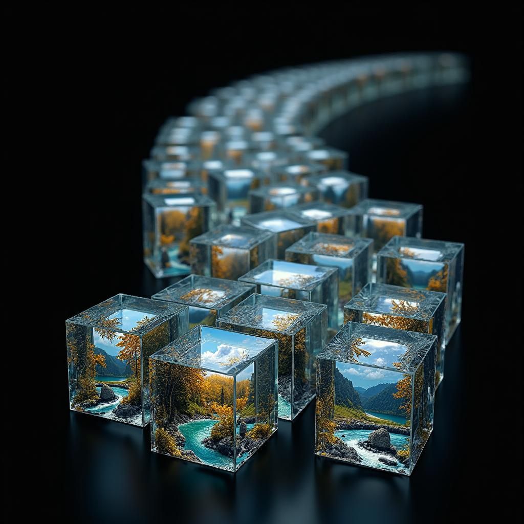 A striking picture of transparent cubes containing landscape scenes extending to infinity. The holographic composition features vivid colors and intricate details against a studio black background.