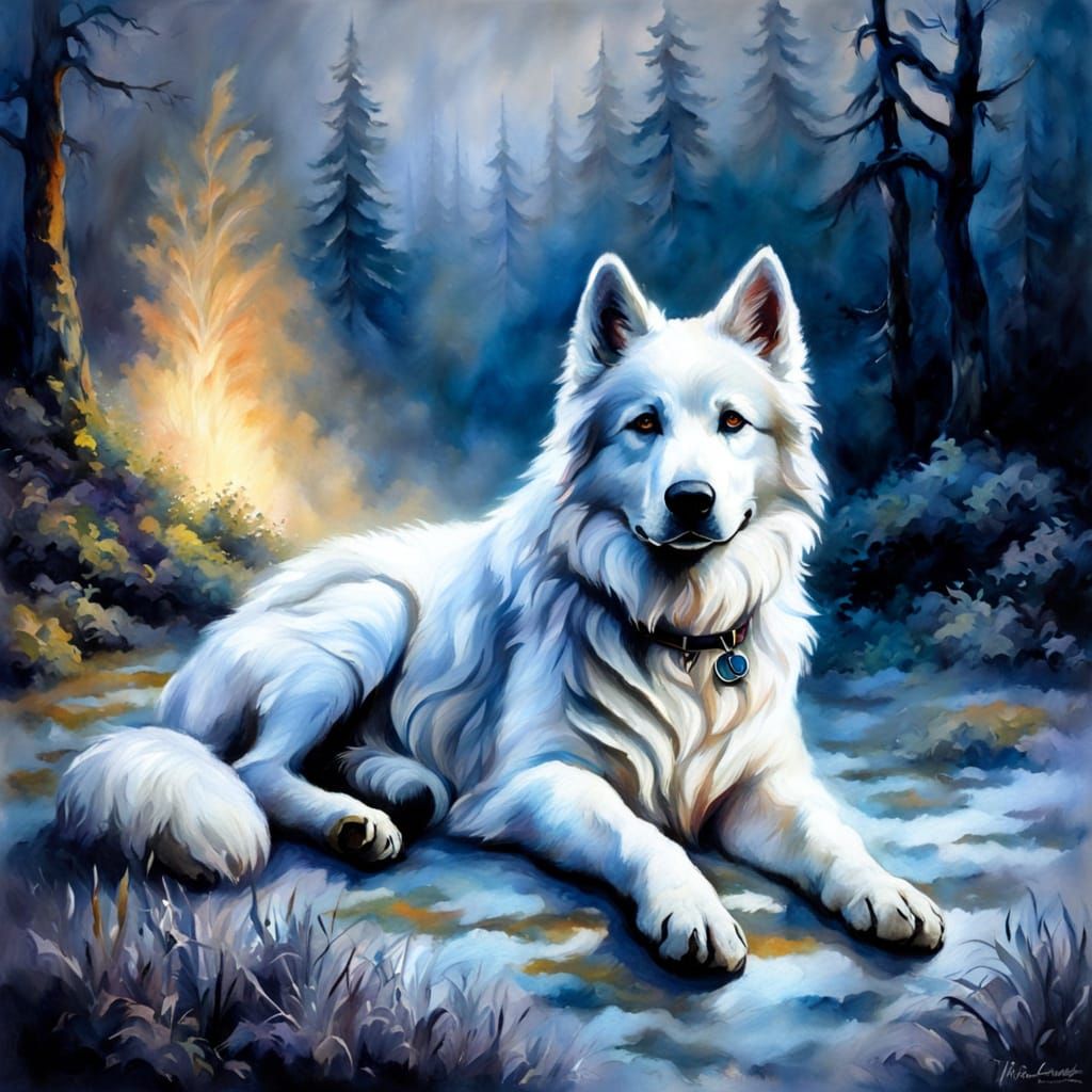 A detailed charcoal drawing of a Berger Blanc Suisse dog lying on the ground, rendered in a maximalist, ethereal style. The artwork emphasizes thick brush strokes and a textured, layered effect reminiscent of impasto gouache.