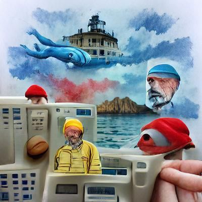 This image shows a scene reminiscent of 'The Life Aquatic with Steve Zissou,' capturing the film's distinctive visual style and quirky nautical atmosphere.