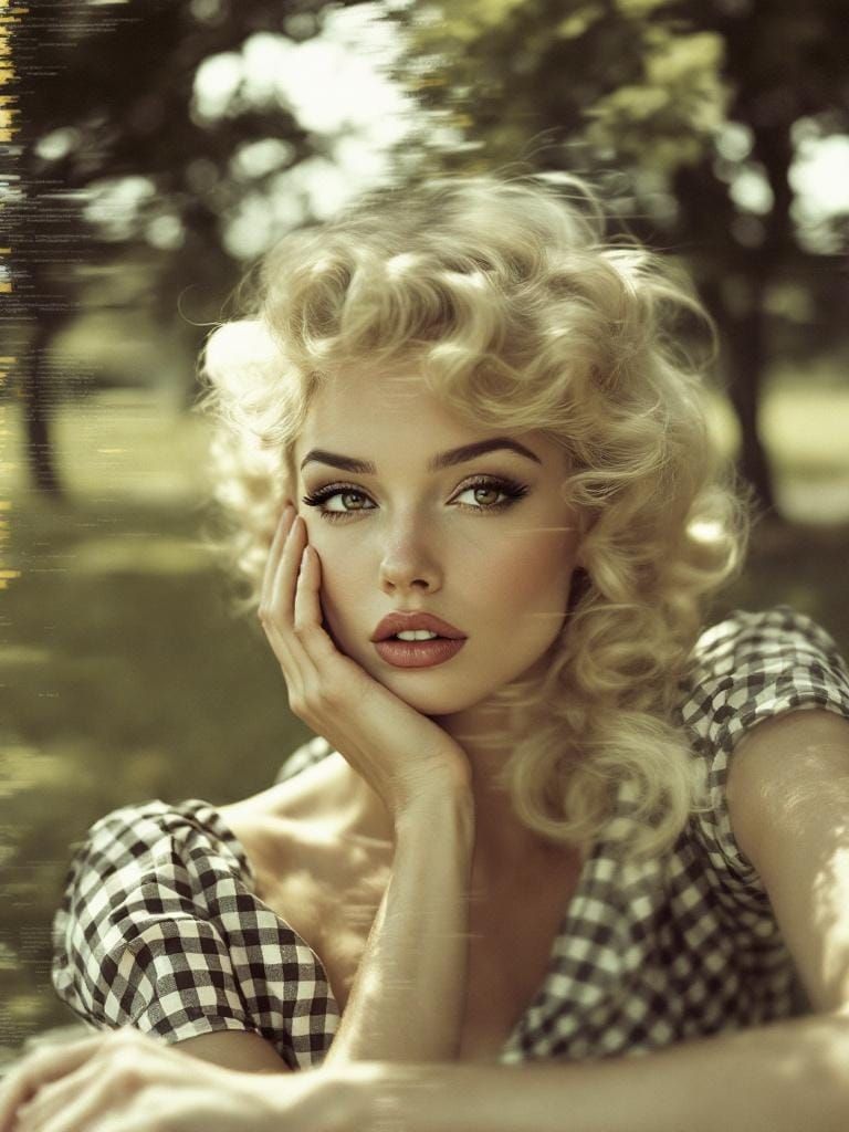 A striking picture of a 1950s-style pin-up woman in a park, distorted by glitch art. The image blends photographic composition with fragmented typography and digital distortion.