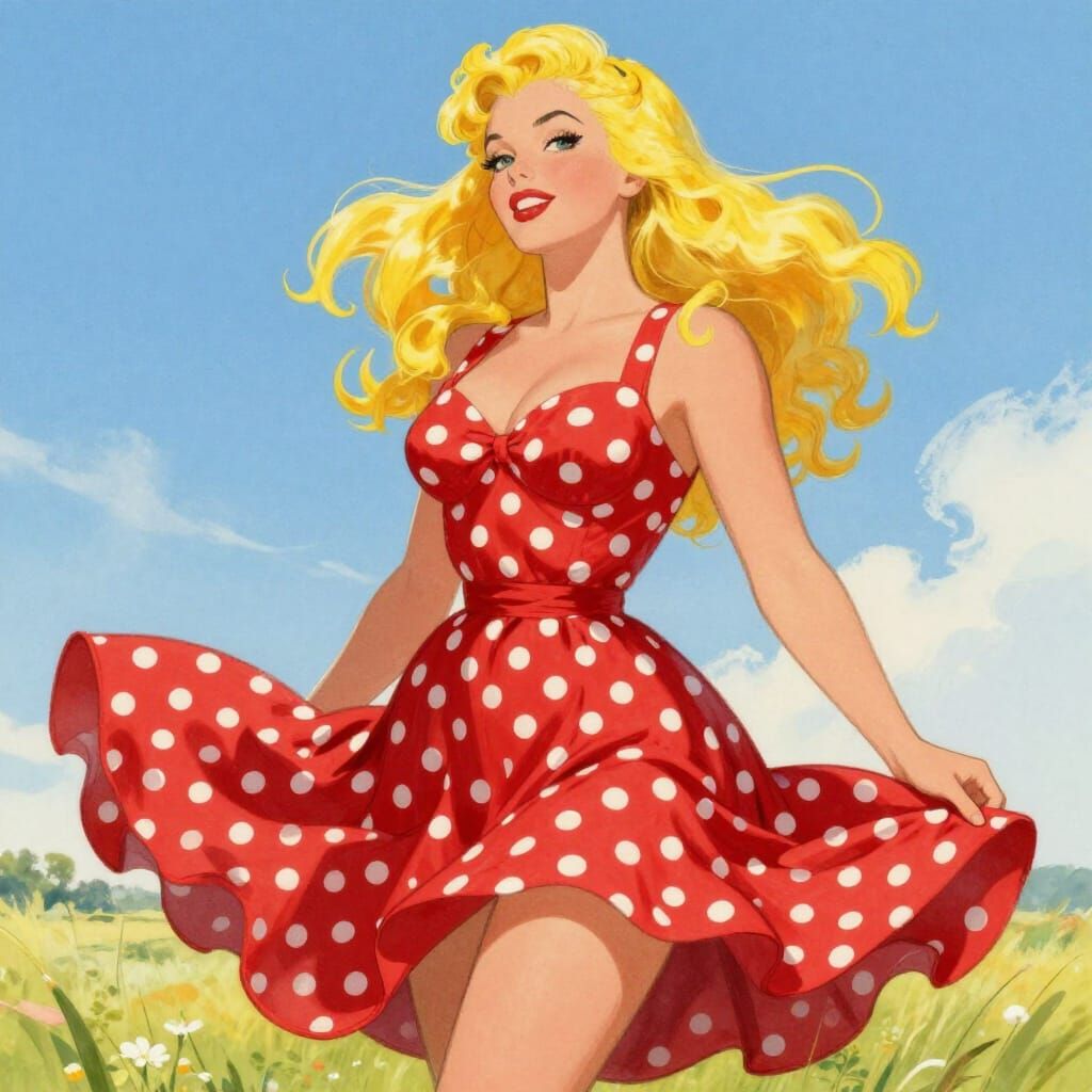 This image shows a woman with flowing yellow hair and a red polka dot dress standing in a meadow. The artwork captures a feeling of joyous freedom, inspired by classic pin-up art and romantic illustration.