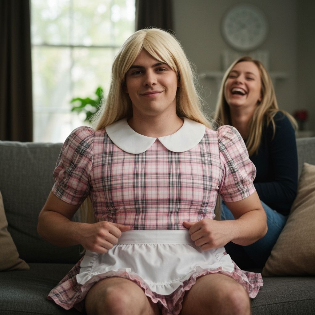A cinematic film still depicts a young man in a plaid minidress and blonde wig on a sofa, with his laughing girlfriend behind him. Shot with film grain and atmospheric lighting.