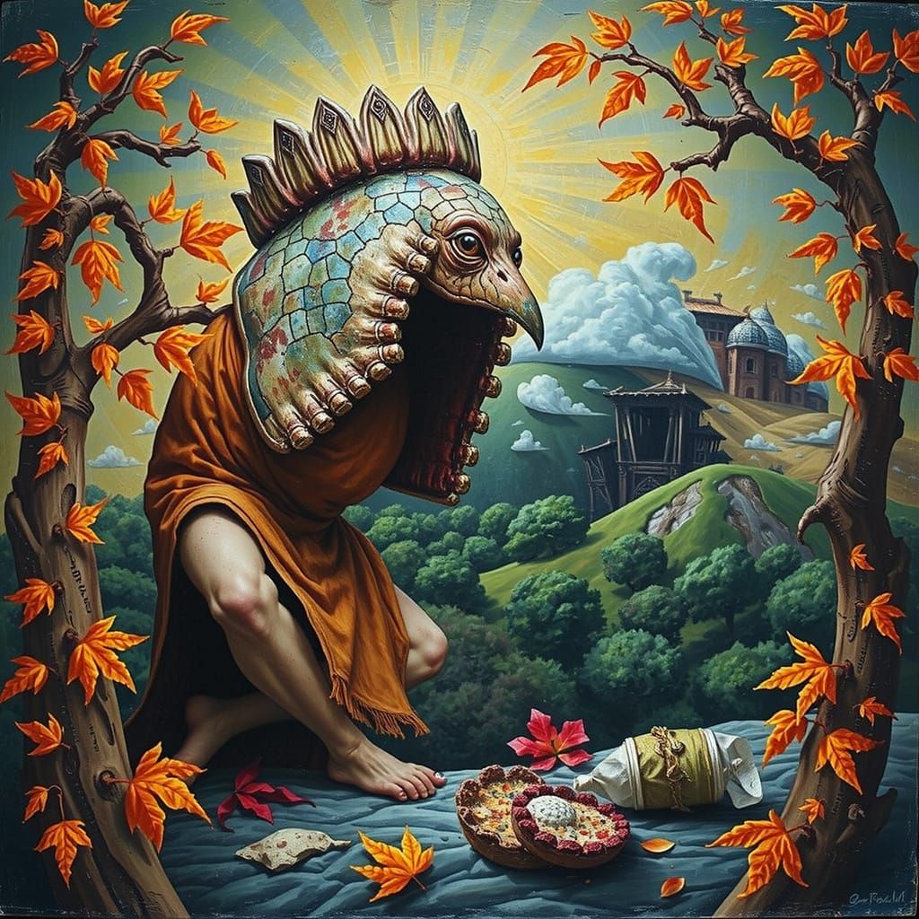 This image depicts a surreal landscape featuring a blue sky, green fields, and red lands, accented by pink skin tones and golden leaves under white light.