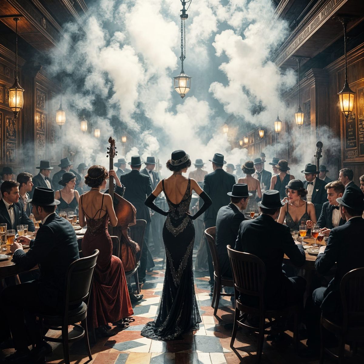 This image depicts a dimly lit 1920s-style speakeasy. The scene evokes the clandestine atmosphere of the Prohibition era.