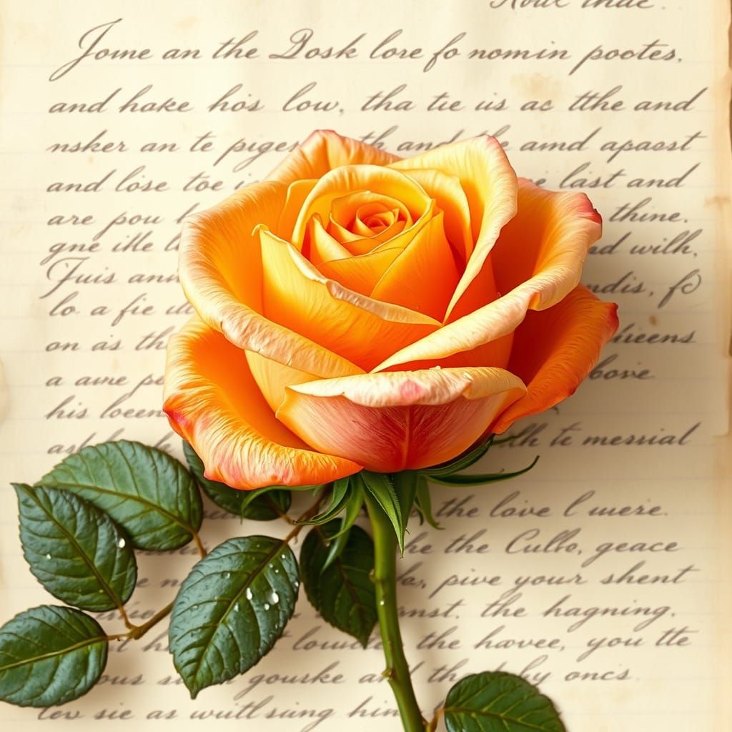 This image features a stunning rose in warm golden and soft pink hues, set against a distressed parchment background with an antique letter and realistic green leaves, evoking a sense of timeless beauty and nostalgia.