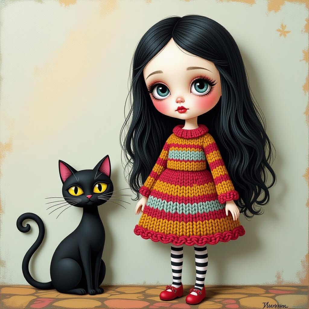 This image features a doll-like girl with large eyes and long limbs, paired with a slender cat. Rendered in a whimsical acrylic style with vibrant, slightly unsettling colors and surreal elements.