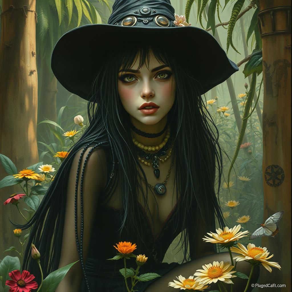 A portrait of a techno-punk witch in a jungle clearing. The image is reminiscent of digital art with flowered elements.