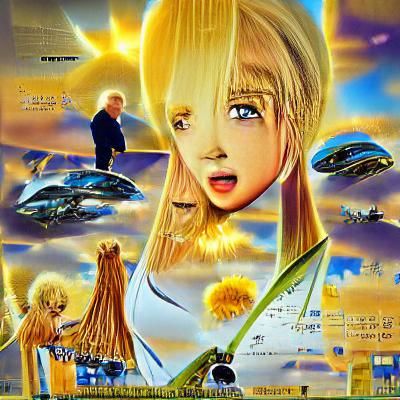 This image shows a young blonde woman in an anime-style dreamscape. Surrounded by alien spacecraft, her hair flows in the solar wind in this poster art.