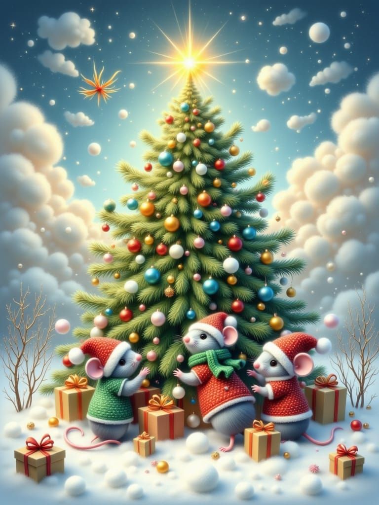 <lora:Koosh Me:1.0> <lora:Winter Feiertage:1.0> <lora:white mouse:1.0> three adorable gray and white mice, dressed in knit caps and colorful Christmas vests are decorating a very large Christmas tree. One is at base of tree placing an ornament, the two other mice are in the tree themselves placing ornaments, ...