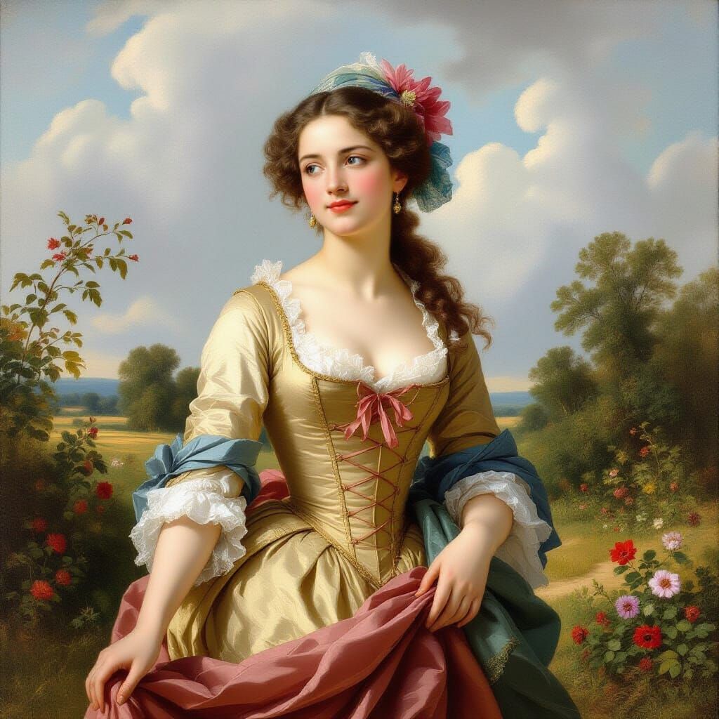 A portrait of a young woman with dark brown hair and blue-grey eyes in a rural 17th-century garden. She is wearing an elegant dress, rendered with delicate details and soft lighting, in the style of 18th-century painting.